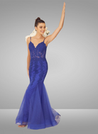 Conviértete en el centro de todas las miradas con este vestido largo sin mangas con apliques bordados y falda sirena de tul brillante de Nox Anabel P1170.