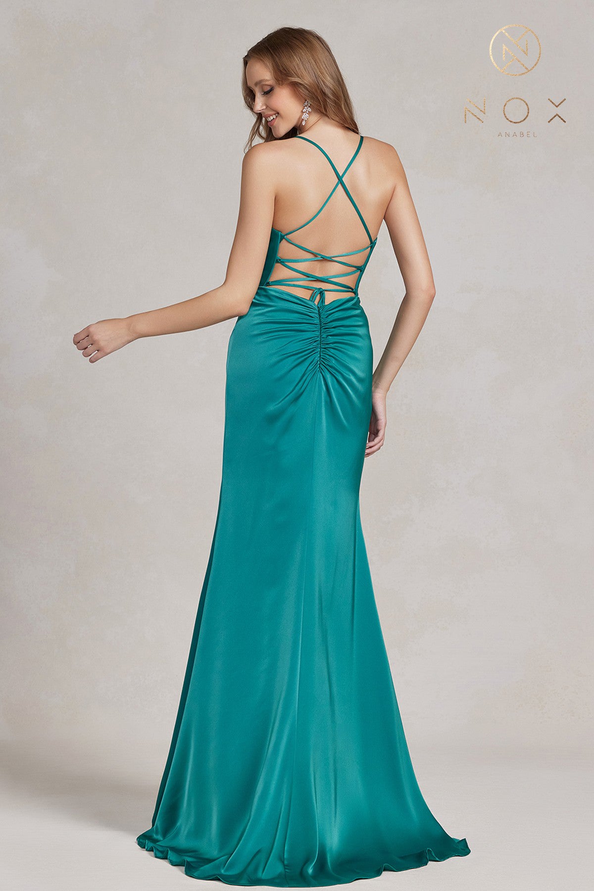Vestido de Satén con Hombros Fríos por Nox Anabel E1048