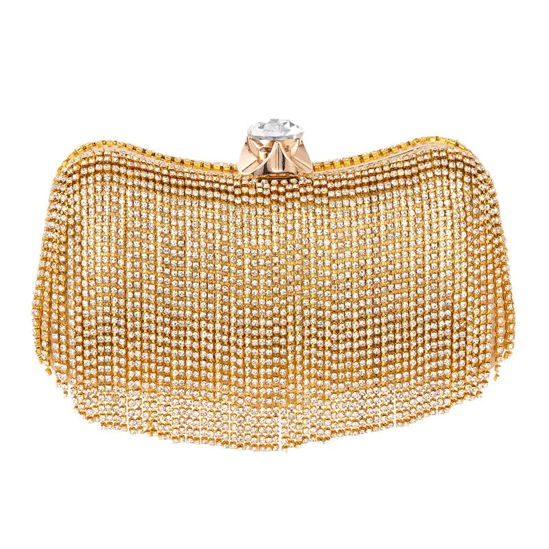 Bolso Dorado Brillante con Pedrería Elegante y Flecos Dorado