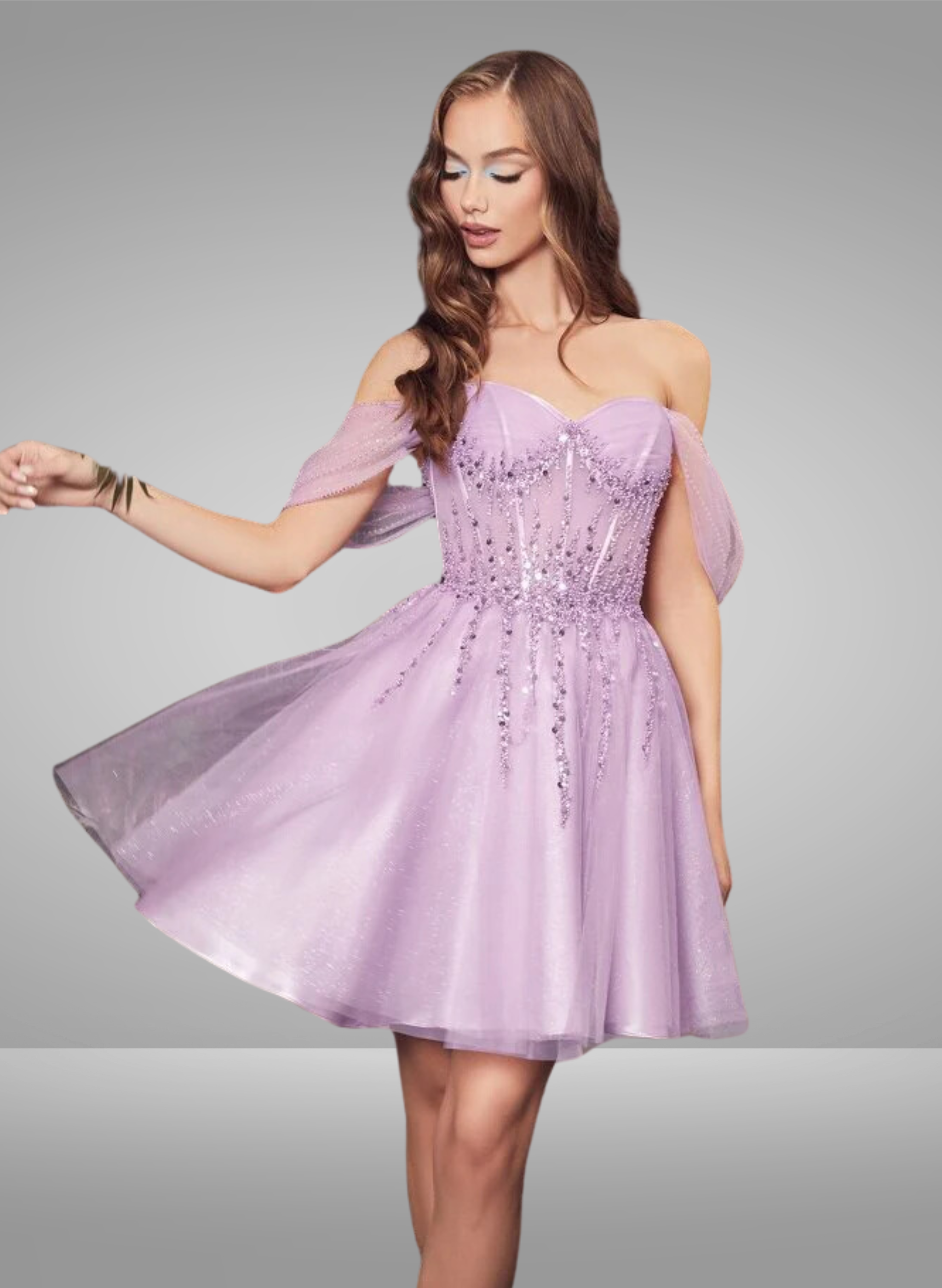 ¡Toda princesa merece un vestido hermoso, y este vestido corto drapeado de línea A con hombros descubiertos toca todas las notas correctas! El corpiño ajustado está estructurado para contornear y se sienta perfectamente sobre una capa de tul brillante adornada con adornos de cuentas que gotean desde la cintura. Es una mirada dulce y soñadora que hará que todos se emocionen en tu próximo evento. El suave drapeado en los hombros le da a este vestido un aire de romance y realeza, y su silueta delicada favorece cada figura. Ya sea que asista a la fiesta de bienvenida o a la Quinceañera, ¡seguro que llamará la atención con este conjunto encantador!