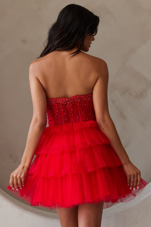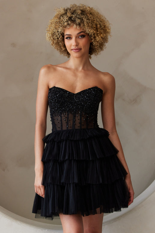 Vestido corto de tirantes con cuentas y volantes de Amelia Couture BZ9999S