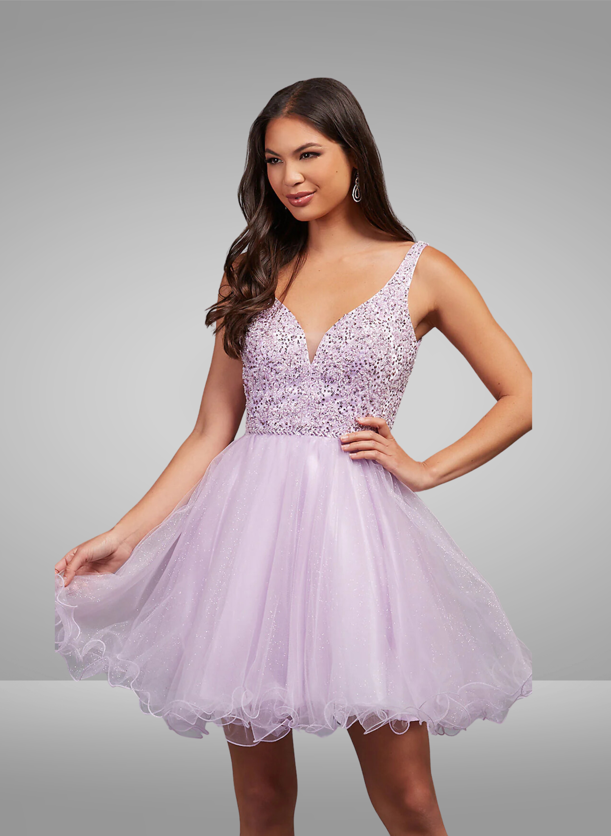 Vestido de tirantes corto con capas y pedrería de Amelia Couture 5058S