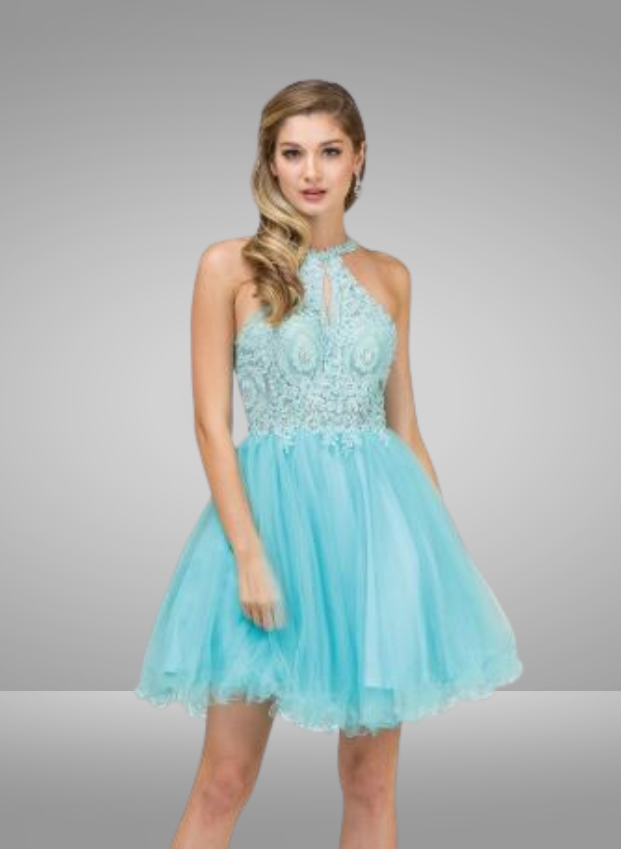 Vestido corto con volantes y escote halter con apliques de Amelia Couture BZ9040S