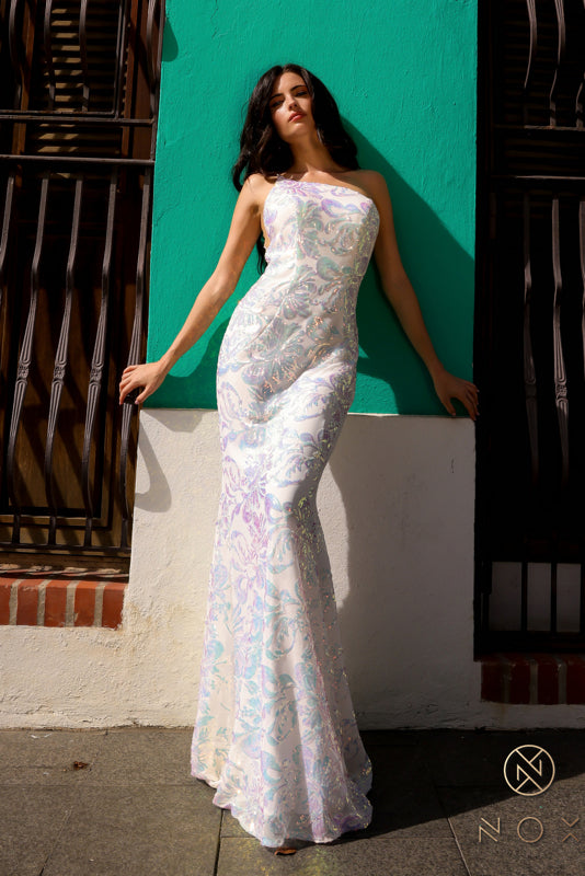 Te encantará dar vueltas con este vestido largo de un hombro con estampado floral de lentejuelas y falda sirena ajustada de Nox Anabel R1308.