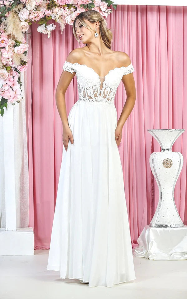 Impresione a todos con la hipnotizante elegancia de esta creación MQ1714 de May Queen. Ornamentado con pedrería y apliques de encaje, este vestido presenta un escote de hombros descubiertos con un escote corazón superpuesto. El corpiño se adorna con varillas de corsé y la espalda se ciñe con un diseño de encaje. La falda de gasa cae en cascada hasta el suelo con una cola de pincel. Haga que todos se desmayen cuando aparezca con esta obra maestra de Reina de Mayo.
