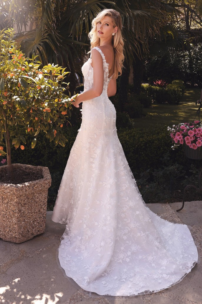 Modesto pero sensual, este vestido de sirena ajustado presenta un corpiño transparente y una falda bellamente drapeada con un dobladillo que sale del piso. Las correas estrechas y el escote corazón enmarcarán elegantemente su collar favorito, mientras que los delicados botones cubiertos descienden desde la baja en V-back y trazarán la cintura trasera central. Las intrincadas apliques de lacio floral 3D decoran la superficie y agregan un toque de fantasía.