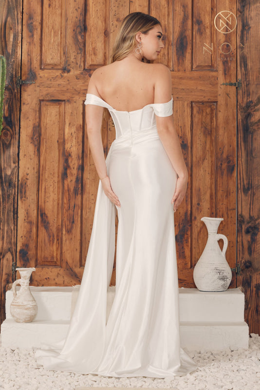 Vestido corsé de satén blanco con hombros descubiertos de Nox Anabel E1043W