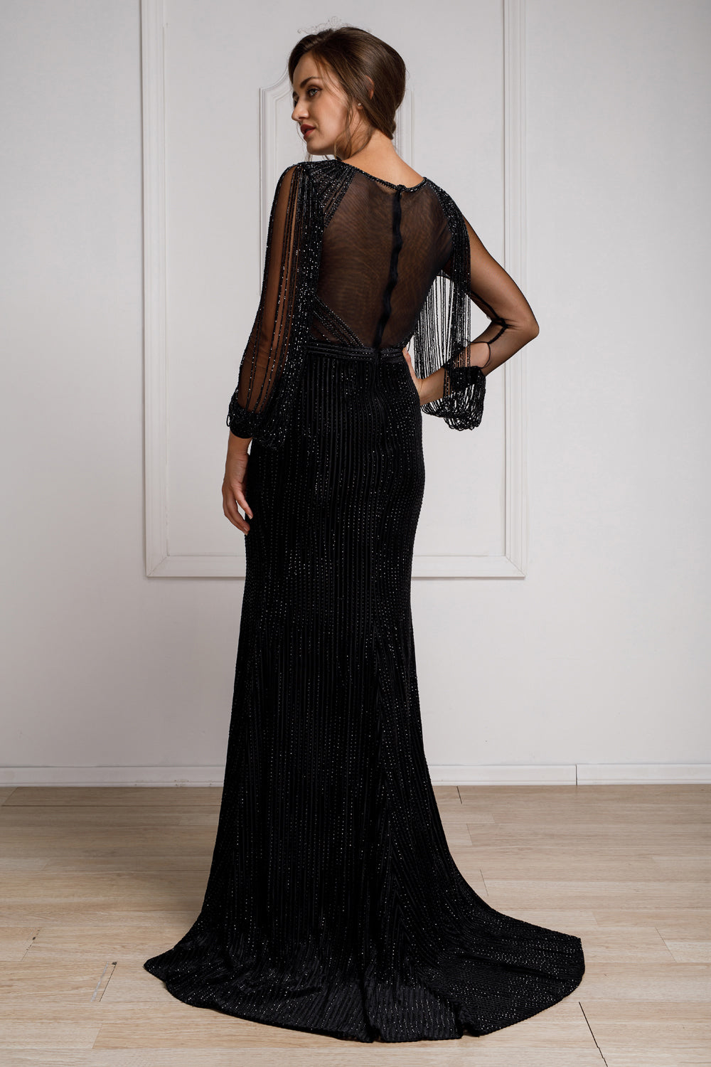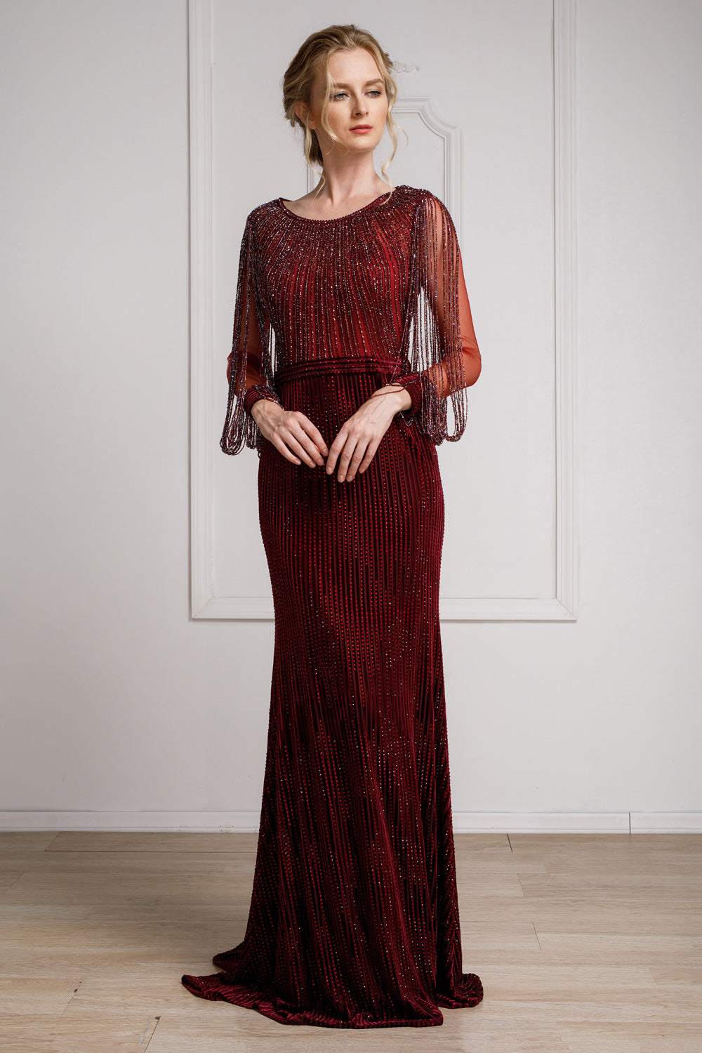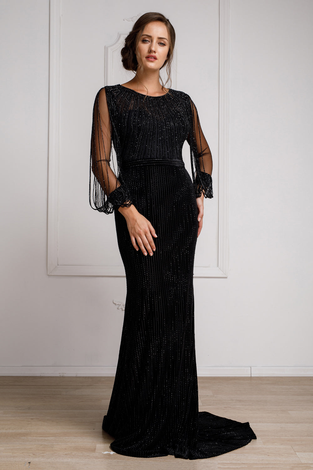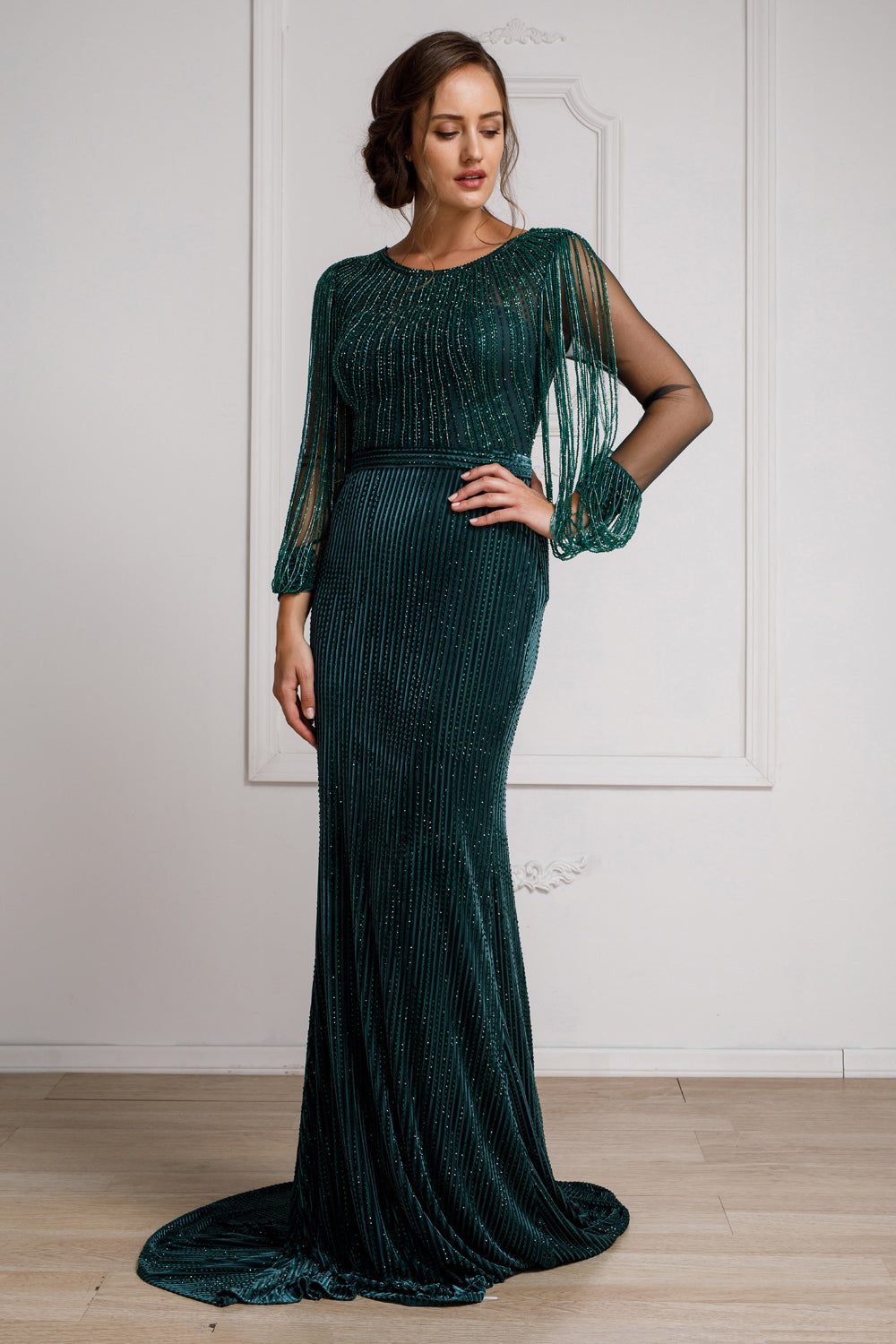 Maxivestido de terciopelo de manga larga con pedrería integral. Mangas de malla con drapeado de pedrería.
