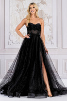 Prepárese para un selfie con este vestido corsé largo sin tirantes con apliques bordados y falda entallada de Amelia Couture 742. Este vestido sin tirantes presenta hermosos bordados en el corpiño de inspiración corpiño transparente y una falda hasta el suelo con abertura lateral en la pierna.