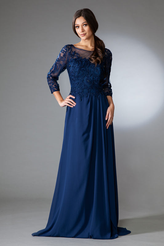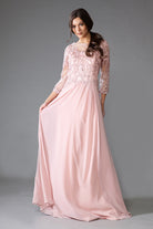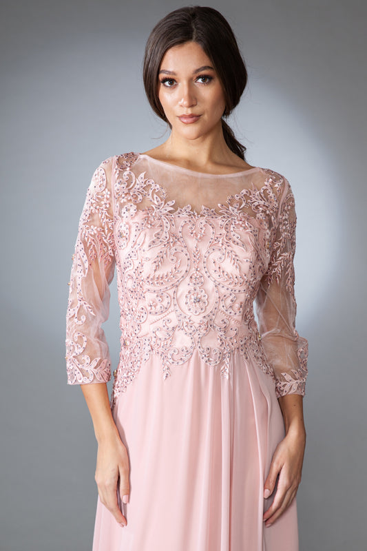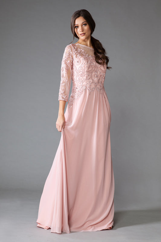 Luzca un estilo modesto y chic con este vestido largo de gasa de manga 3/4 bordado con abalorios y falda Corte