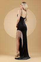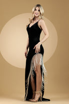 Amelia Couture BZ9015V - Vestido de terciopelo con flecos, sin mangas y con aberturas