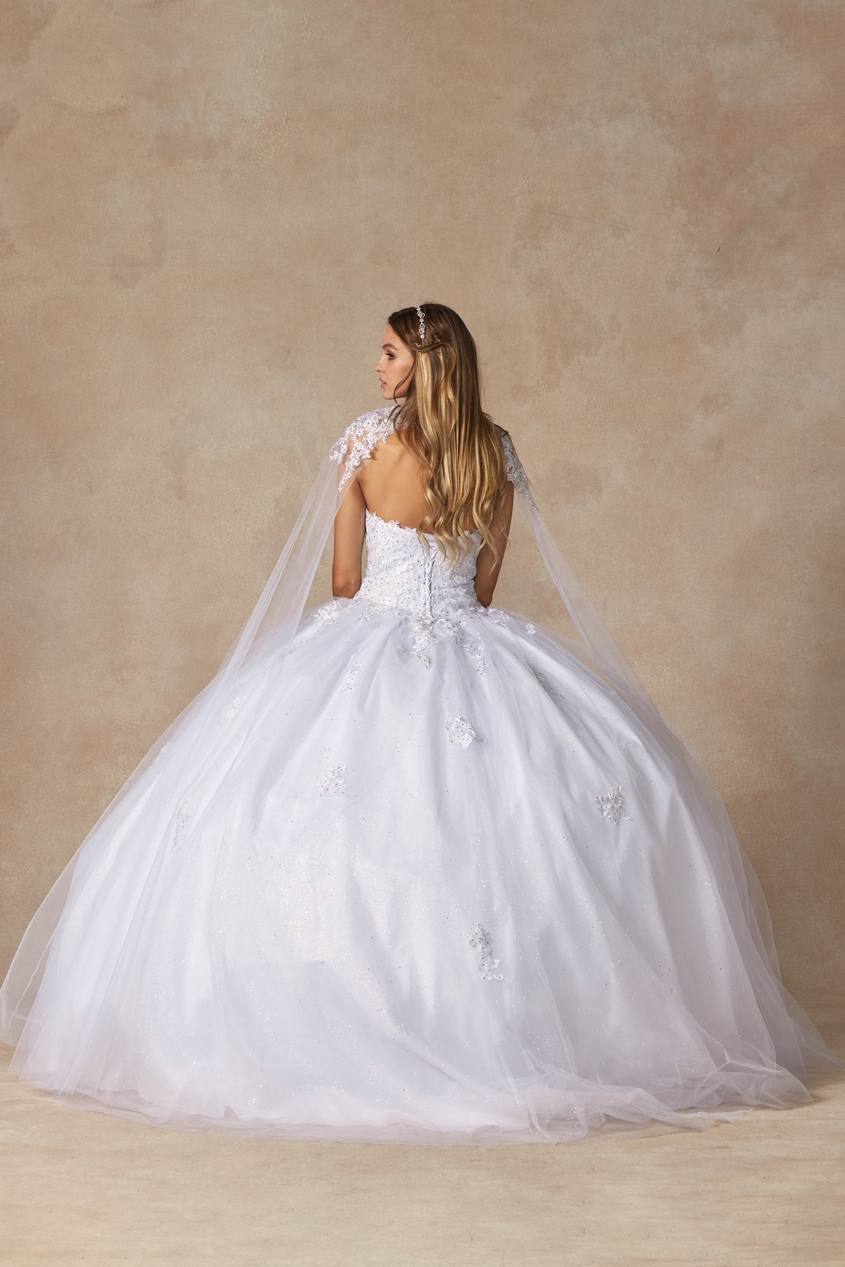 Vestido Blanco de baile con capa y apliques sin tirantes de Juliet 1440