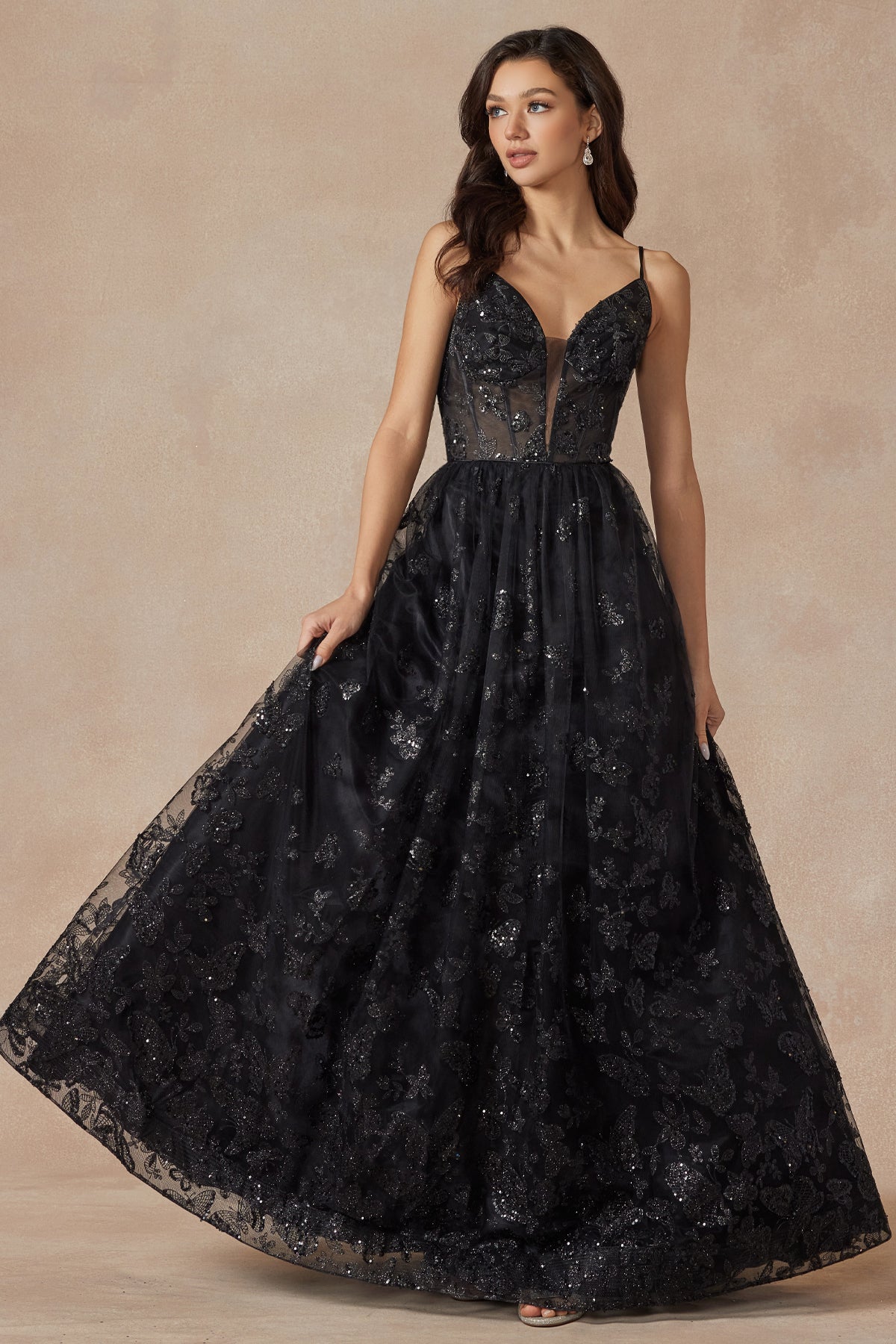 Luce impresionante con este vestido largo sin mangas con estampado de mariposas de purpurina y falda de línea A de Juliet 2413.