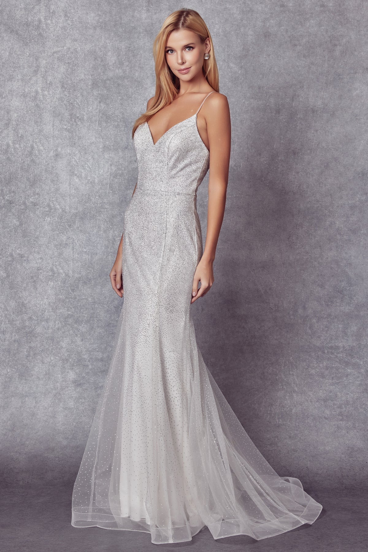Cautive a la sala con este vestido largo sin mangas con espalda abierta y falda sirena ajustada de Juliet 271. Este brillante vestido viene con escote en V de malla brillante y cierre de cremallera con cola de barrido.
