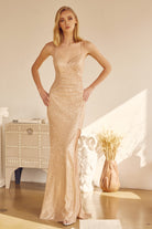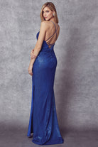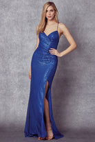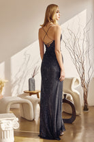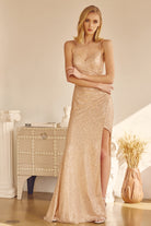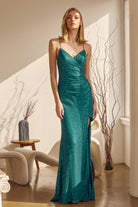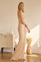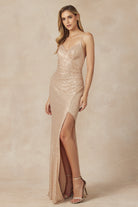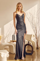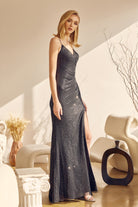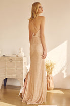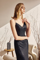Vestido de fiesta de lentejuelas con escote en V y abertura en la falda.
