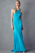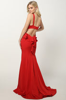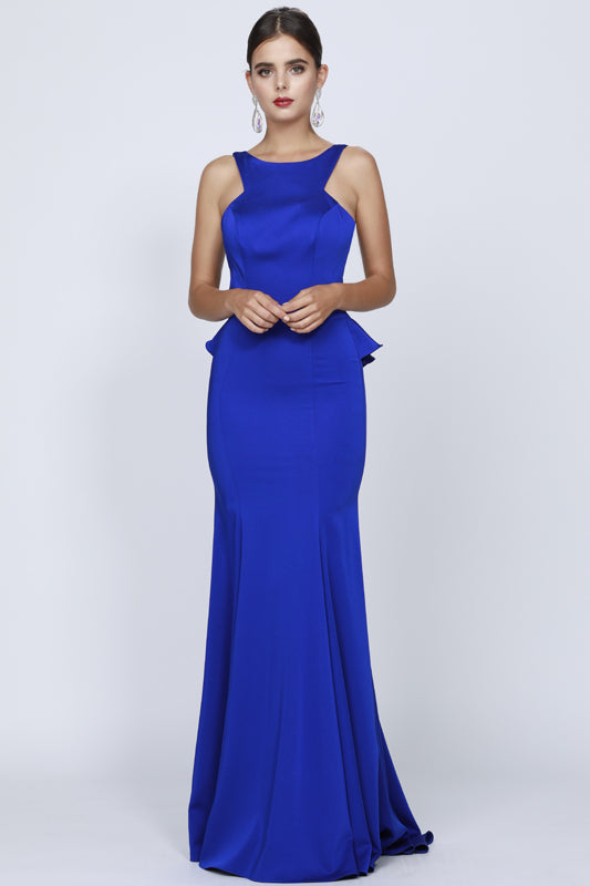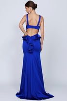 Luzca un look inolvidable con este vestido sin mangas con escote halter y falda entallada de Juliet 645. Este precioso vestido viene con espalda con volantes, espalda abierta con cierre de cremallera y cola de barrido.