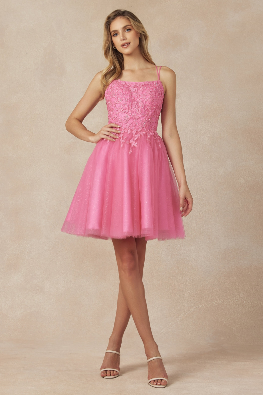 Quítate el aliento con este vestido corto sin mangas con apliques florales y falda brillante de línea A de Juliet 860.