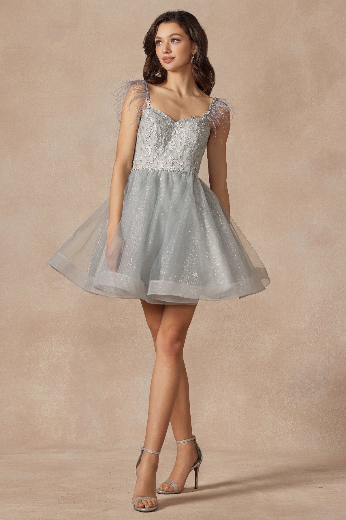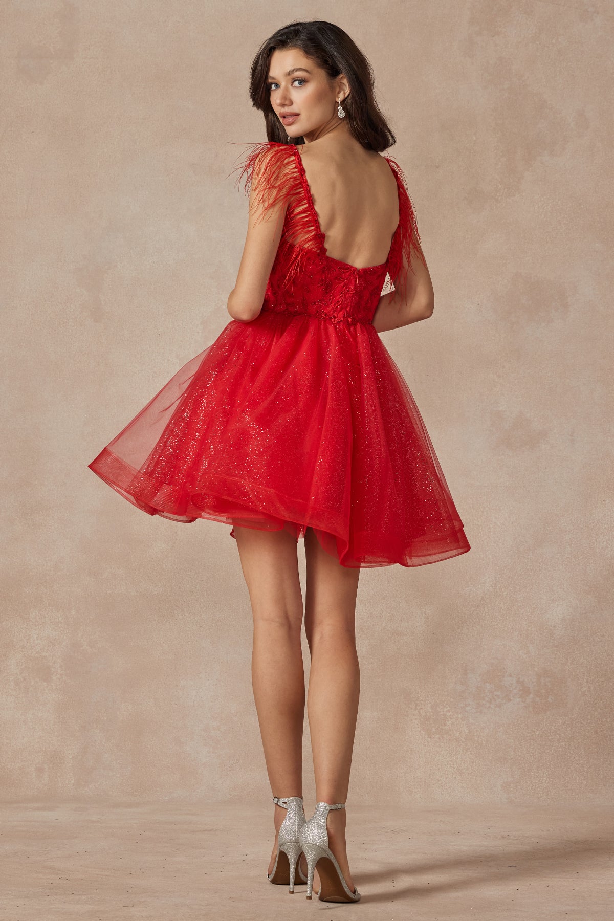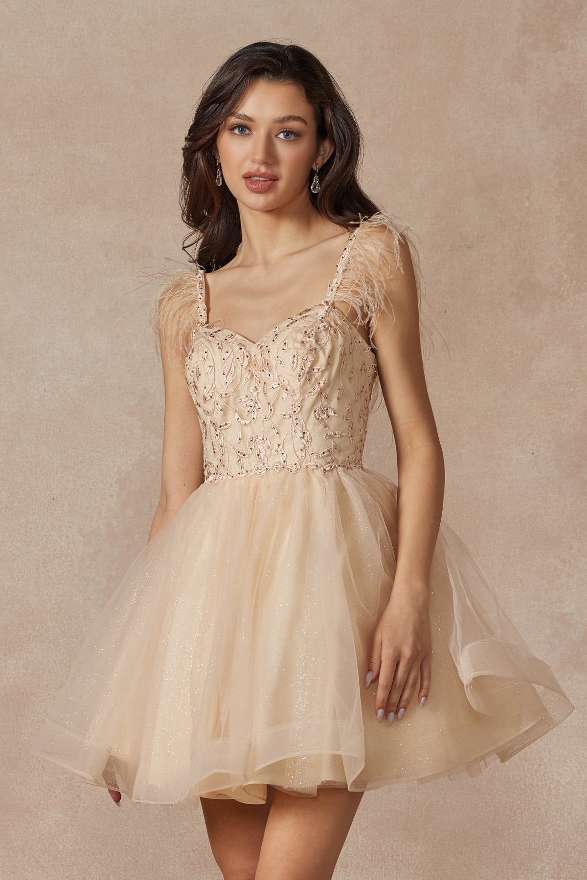 Baila toda la noche con este vestido corto de plumas bordado con pedrería y falda de línea A Juliet 881.