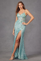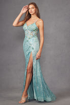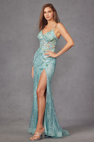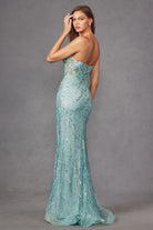 Cautive a la sala con este vestido corsé largo sin mangas con apliques de lentejuelas y falda de corte ajustado de Juliet JT2425A.