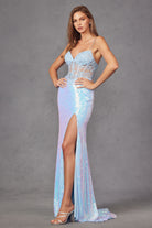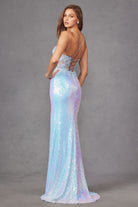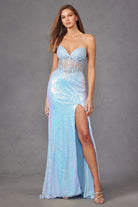 Luzca un look inolvidable con este vestido largo sin mangas de lentejuelas iridiscentes con apliques de encaje y falda con abertura ajustada de Juliet JT2433A.