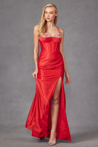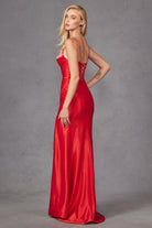 Baile toda la noche con este vestido largo de satén sin mangas con pedrería y falda ajustada de Juliet JT2434A.