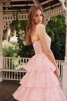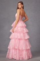Eleve su atuendo de noche con este vestido corsé largo sin mangas con apliques de purpurina y falda en capas de corte-A de Juliet JT2438K.