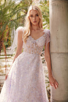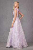Haga que su día especial brille con este delicado vestido largo sin mangas con apliques florales en 3D y estampado de purpurina con falda de corte-A de Juliet JT2439K.