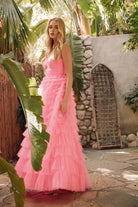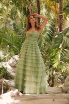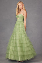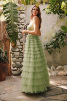 Luzca a la moda con este vestido largo de tirantes con pliegues en forma de ojo de cerradura y falda de volantes en corte-A de Juliet JT2456H.