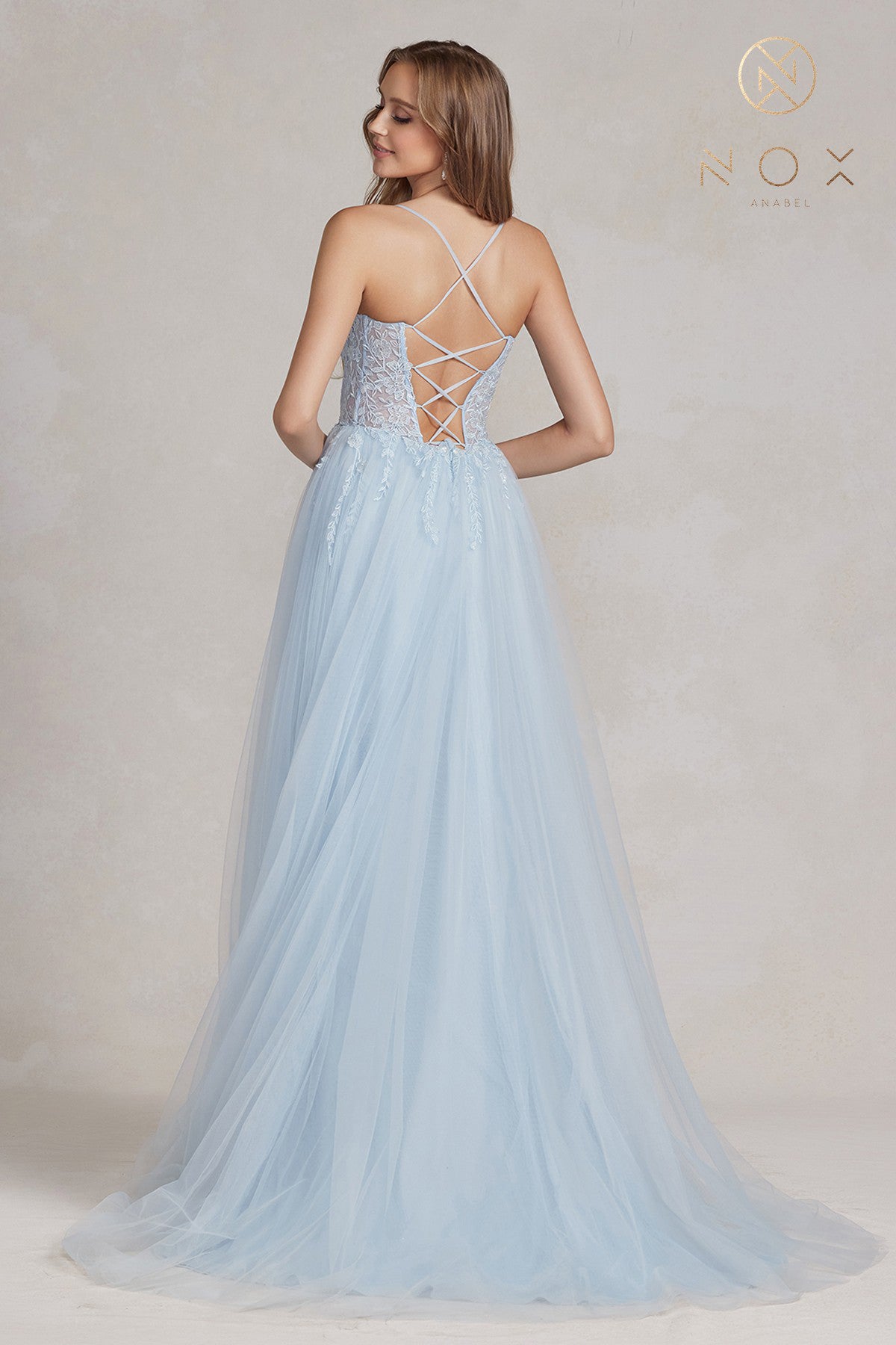 Hazte un selfie con este vestido corsé largo sin mangas con apliques de encaje y pedrería y falda de tul con abertura en forma de A de Nox Anabel J1089.