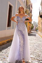 Vestido con apliques y sobrefalda con hombros fríos