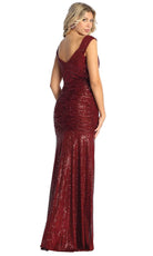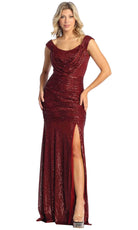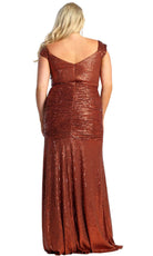 Afronte la noche con belleza y gracia de tentadora llevando la creación May Queen RQ7950. Brillantes lentejuelas adornan todo el corpiño que favorece la figura, enmarcado con un escote de pico sin hombros y mangas casquillo. La falda de tubo de largo completo presenta una amplia cola y una abertura lateral alta para mostrar sus coquetas piernas. Completa el look de este vestido una espalda en V medio abierta con un cierre de cremallera central que une toda la pieza. Haga una gran entrada que seguramente asombrará a la multitud con este vestido de noche May Queen RQ7950. Las modelos llevan los colores Borgoña, Verde Cazador y Óxido.