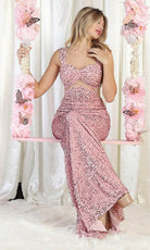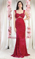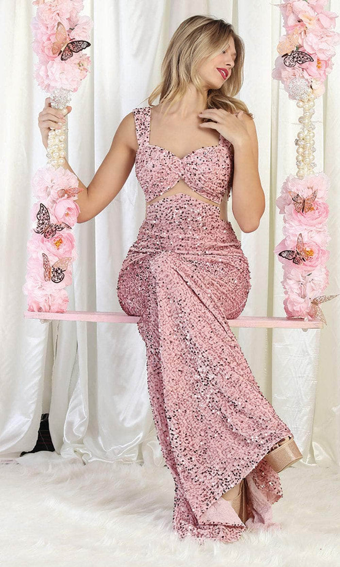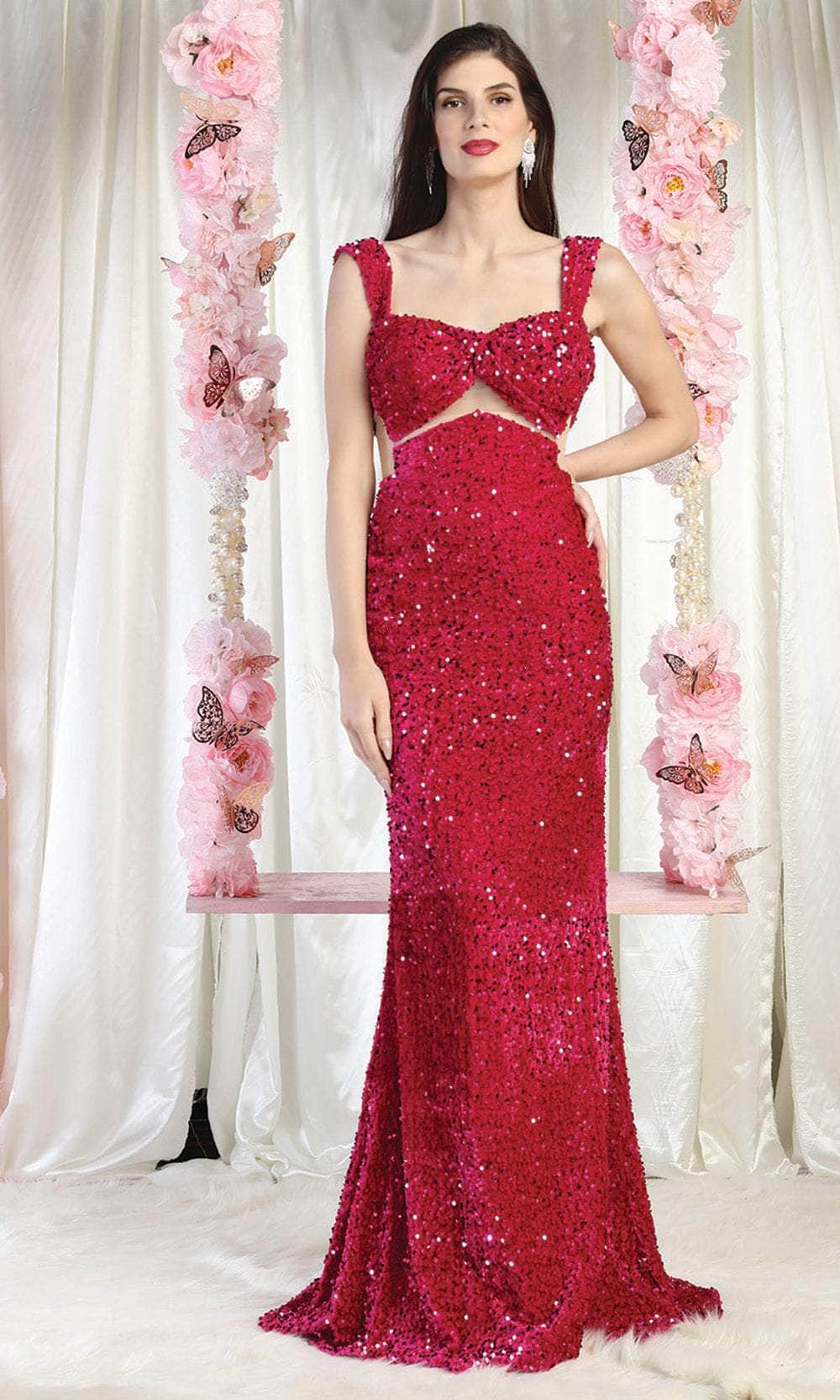 Déjese sorprender por el espectacular encanto de esta creación May Queen RQ8004. Elocuentemente engalanada con brillantes lentejuelas por toda su tentadora longitud, esta inspirada pieza presenta un escote corazón con tirantes cónicos. La parte central revela un acento de ilusión, así como recortes laterales transparentes. La espalda tiene una abertura baja con cierre de cremallera oculta. La falda de sirena se esculpe y acampanada en un desenlace arrollador. Deje una sinfonía indeleble de glamour y romanticismo en esta obra maestra de impresionante confección May Queen RQ8004. Las modelos llevan los colores Blush, Borgoña y Fucsia.