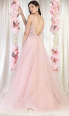 Haga que su noche sea digna de recordar con esta obra maestra May Queen RQ8024. Esta belleza atemporal exhibe un aplique floral en 3D y un intrincado bordado, enriquecido con abalorios brillantes en el corpiño superior ajustado. Consta de un escote en pico pronunciado con detalle de inserción transparente, y tirantes espagueti que estilizan los hombros antes de caer a la espalda abierta en forma de V profunda. La falda está confeccionada en una favorecedora silueta de Corte-A, completada con un dobladillo de crin y una espectacular cola de barrido. Florezca con opulencia con este precioso vestido Reina de Mayo RQ8024. Las modelos llevan los colores Blush, Dusty Blue y Red.