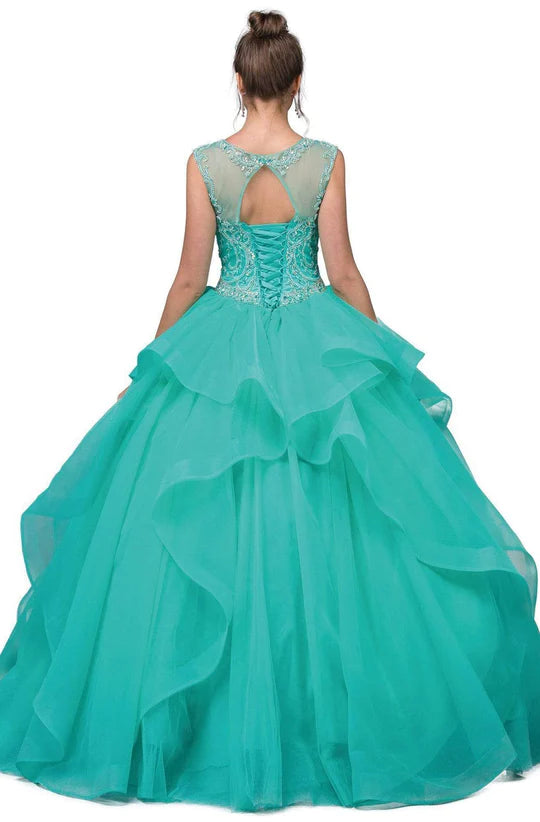 Intrincadamente adornado con joyas junto con su corpiño bordado transparente, este vestido revela un escote redondo ilusión con delicadas mangas casquillo. Un forro de escote corazón complementa el corte de ojo de cerradura ilusión en la parte posterior del corsé. Detalles resplandecientes adornan la cintura vasca mientras hileras de capas de gasa cubren la silueta del vestido de gala. Haz que todos se desmayen en esta obra maestra de Dancing Queen.