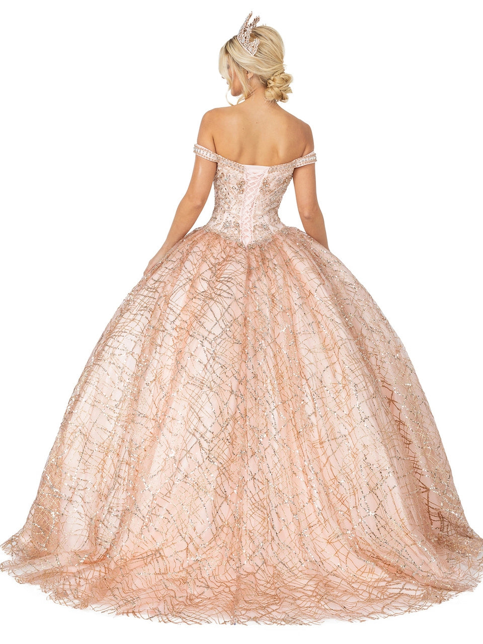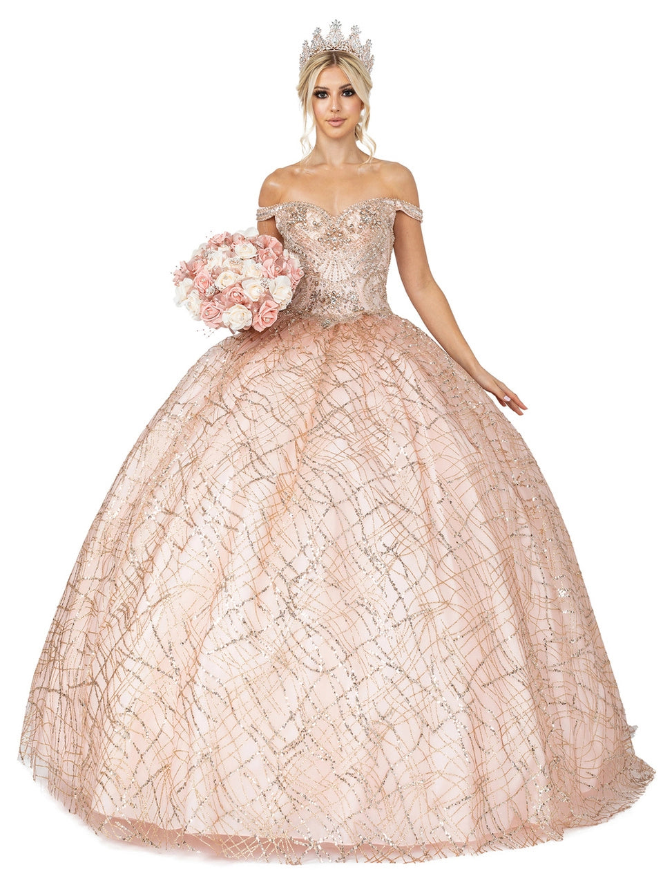Hermoso vestido de Dancing Queen disponible para embellecerte ese día tan importante. Con hombros descubiertos y pedrería en el corpiño, falda de tull amplia con líneas brillantes y corsé en la espalda.