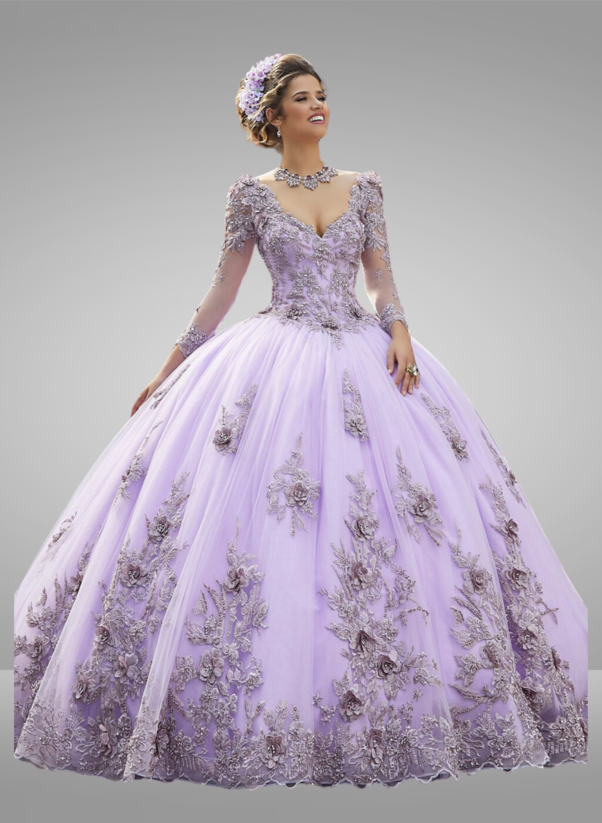 Vestido de quinceañera color lavanda antiguo con corpiño bordado metálico y escote en V