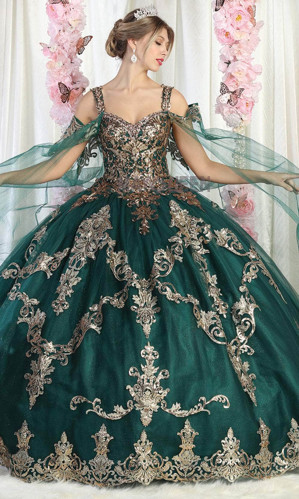 Deje que su look sea el tema de conversación con un vestido de baile vocal de May Queen LK210. Impresionante en este diseño dramático, este magnífico vestido formal hará que se quede boquiabierta con su exuberante falda llena y su regio atractivo. El torso aparece dorado con filigranas metálicas, y el escote Reina Ana sin mangas se combina con espectaculares fajines sin hombros que llegan hasta el suelo. La falda del vestido de baile está adornada con capas de tul, purpurina y filigranas doradas por todas partes. Envuélvase en este estilo ganador para la noche de May Queen LK210 Las modelos llevan los colores Borgoña y Huntergreen.