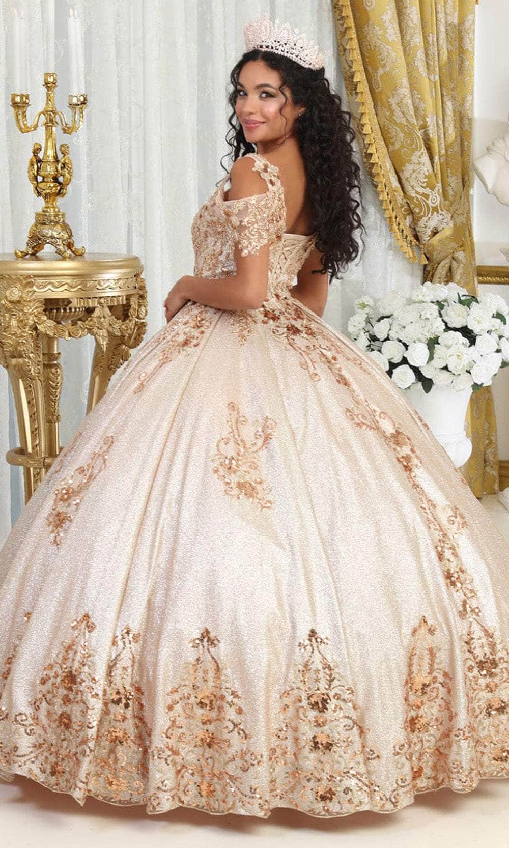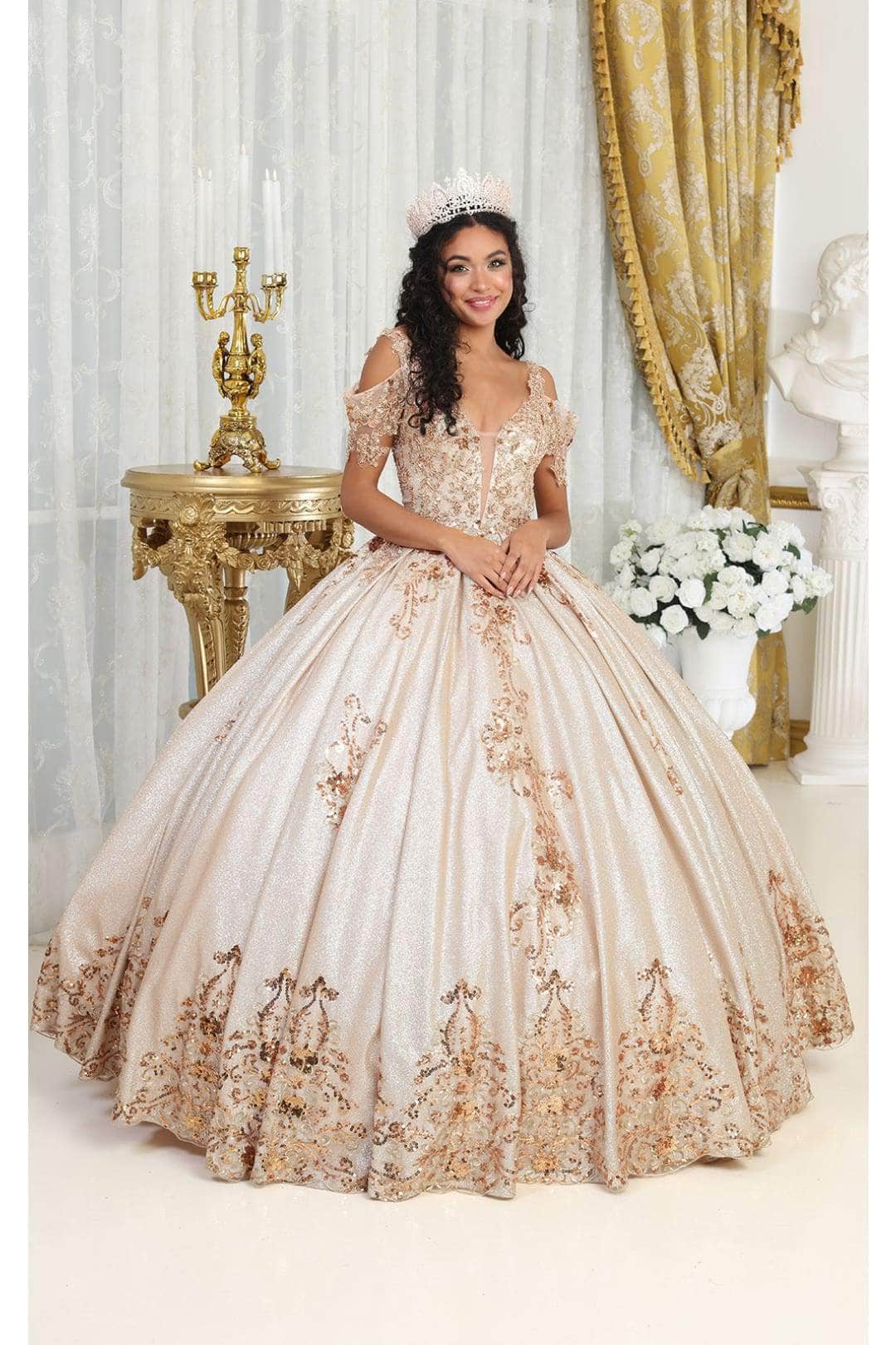 Cautive a todos con el encanto y la grandeza de este vestido de quinceañera May Queen LK213. Intrincadamente adornado con detalles brillantes e impresionantes motivos de encaje metálico en todo, esta noche cuenta con un profundo escote en V complementado con una inserción de ilusión. Confeccionado con apliques en las mangas y un diseño de hombros fríos, la espalda está ceñida con un corsé que garantiza un ajuste ideal. Las capas de tela caen en cascada con gracia, dando forma a una encantadora silueta de vestido de baile con un dobladillo hasta el suelo. Sumérjase en el sueño de su día especial con nuestra majestuosa obra maestra May Queen LK213. La modelo lleva puesto el color Rose Gold.