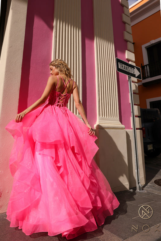 Haz una gran entrada con este vestido corsé largo sin mangas con apliques de encaje floral bordado y falda de volantes en capas de línea A de Nox Anabel H1351.