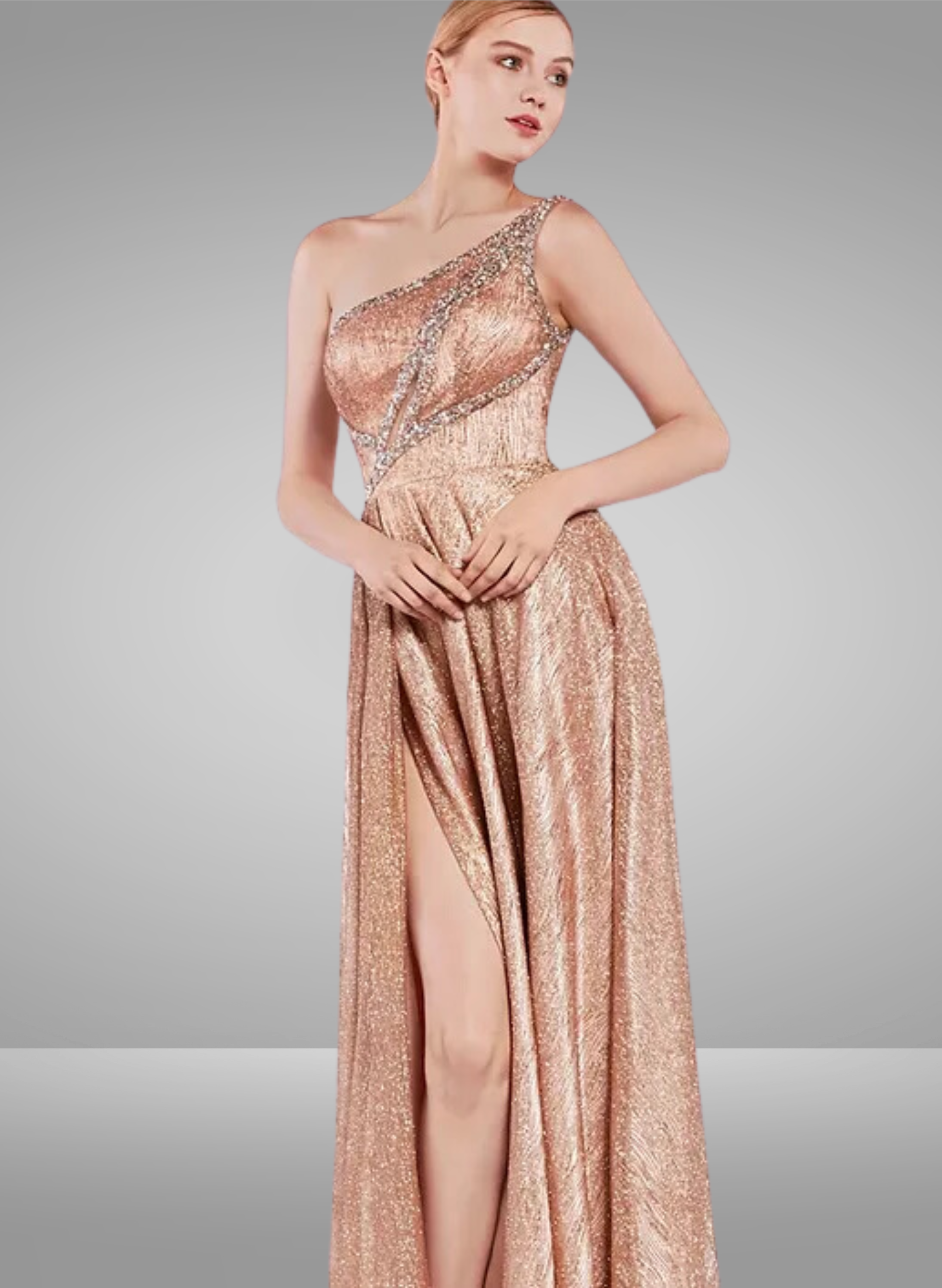 Vestido de línea A con estampado floral de purpurina con ribete de cuentas y cinturón. COLOR ORO ROSA, PLATA