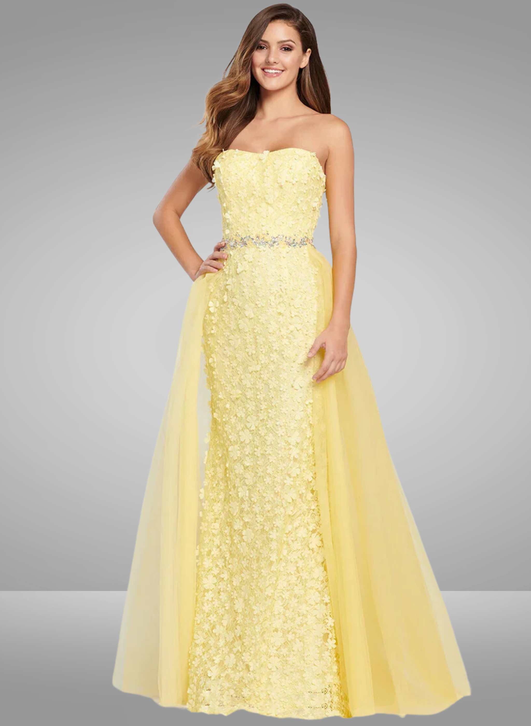 escote sin tirantes y silueta entallada, una extravagante superposición de tul