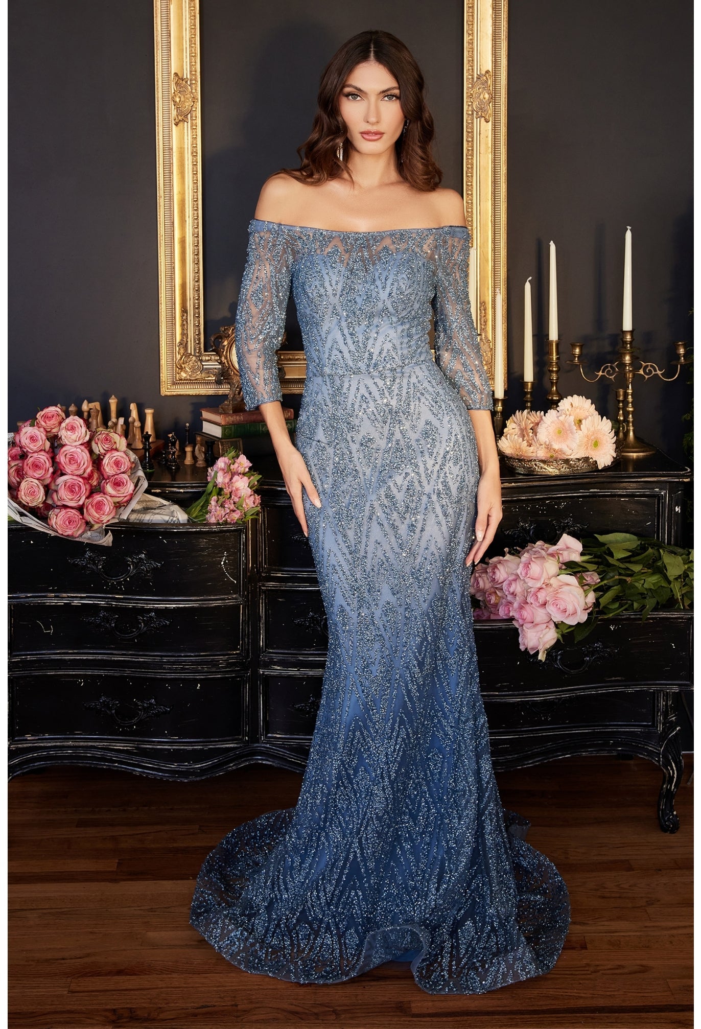 Presente a su evento de cóctel con un aspecto deslumbrante con este vestido adornado con manga larga fuera del hombro. Este número azul ahumado sacará a relucir su glamazon interior y hará que las cabezas giren mientras usted hace su entrada con confianza. Al instante fascinante, su silueta ajustada con una manga de tres cuartos y estampados adornados con estampado de diamantes está aquí para mantener todos los ojos en usted. ¡Así que abraza tu estilo moderno y prepárate para bailar toda la noche con una sofisticación única en este conjunto glamoroso!