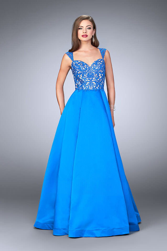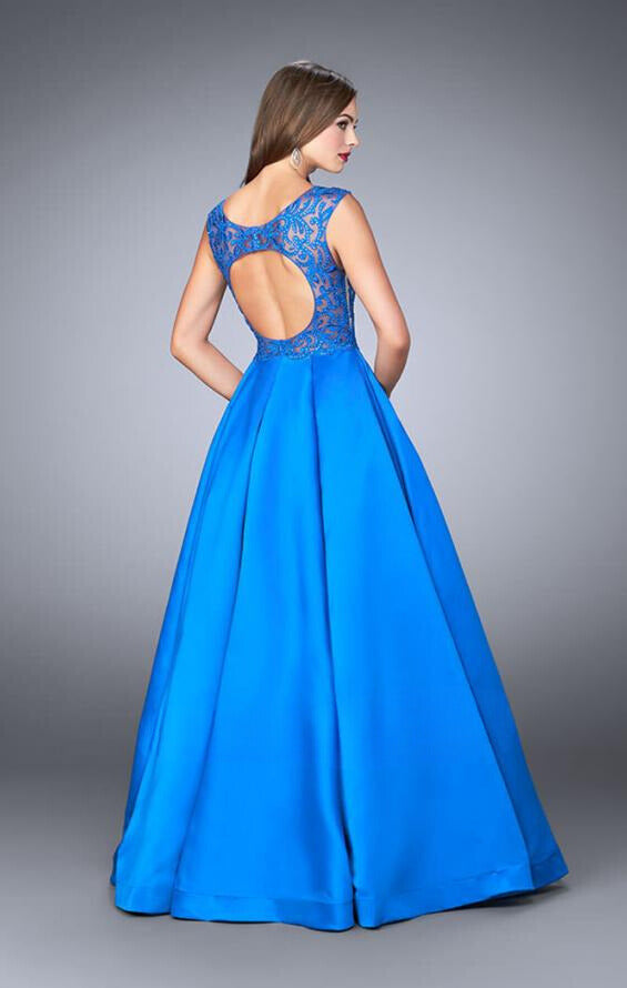 Elaborado vestido de satén con parte superior bordada y espalda abierta. Falda de línea A. Cierre de cremallera en la espalda.