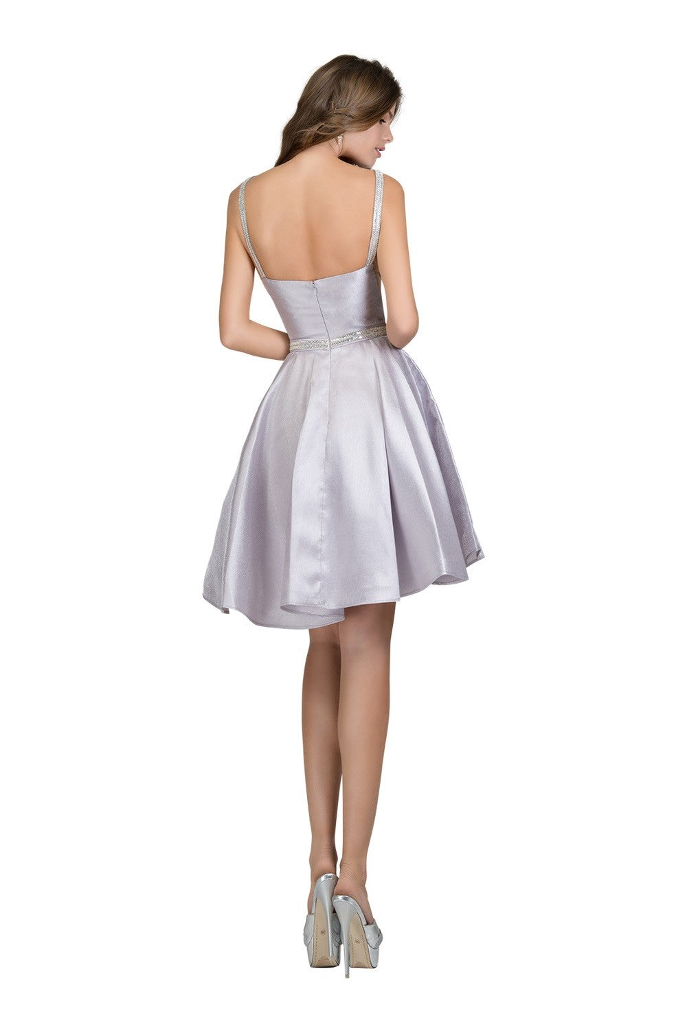 Vestido de fiesta corto a la altura del muslo con detalle de cinturón de pedrería. Diseño entallado y acampanado y tul añadido en la parte inferior de la falda para mayor volumen. Escote en V profundo, tirantes y cremallera oculta en la parte media de la espalda.