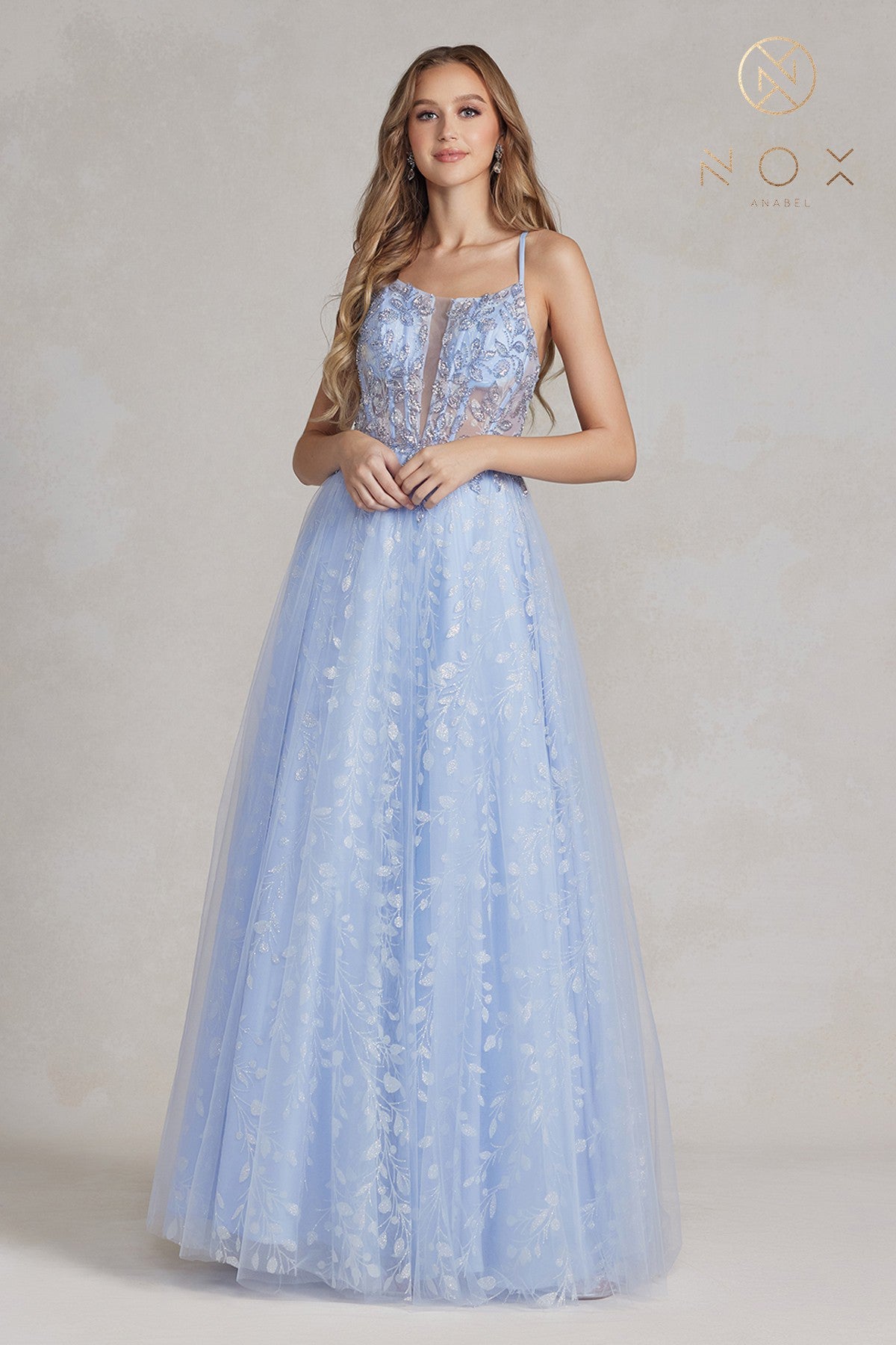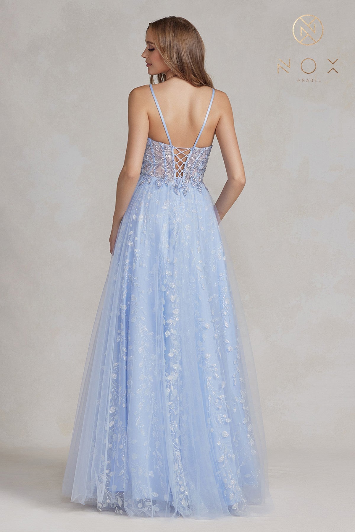 Vestido Largo con Apliques Florales y Espalda Corsé de Nox Anabel C415
