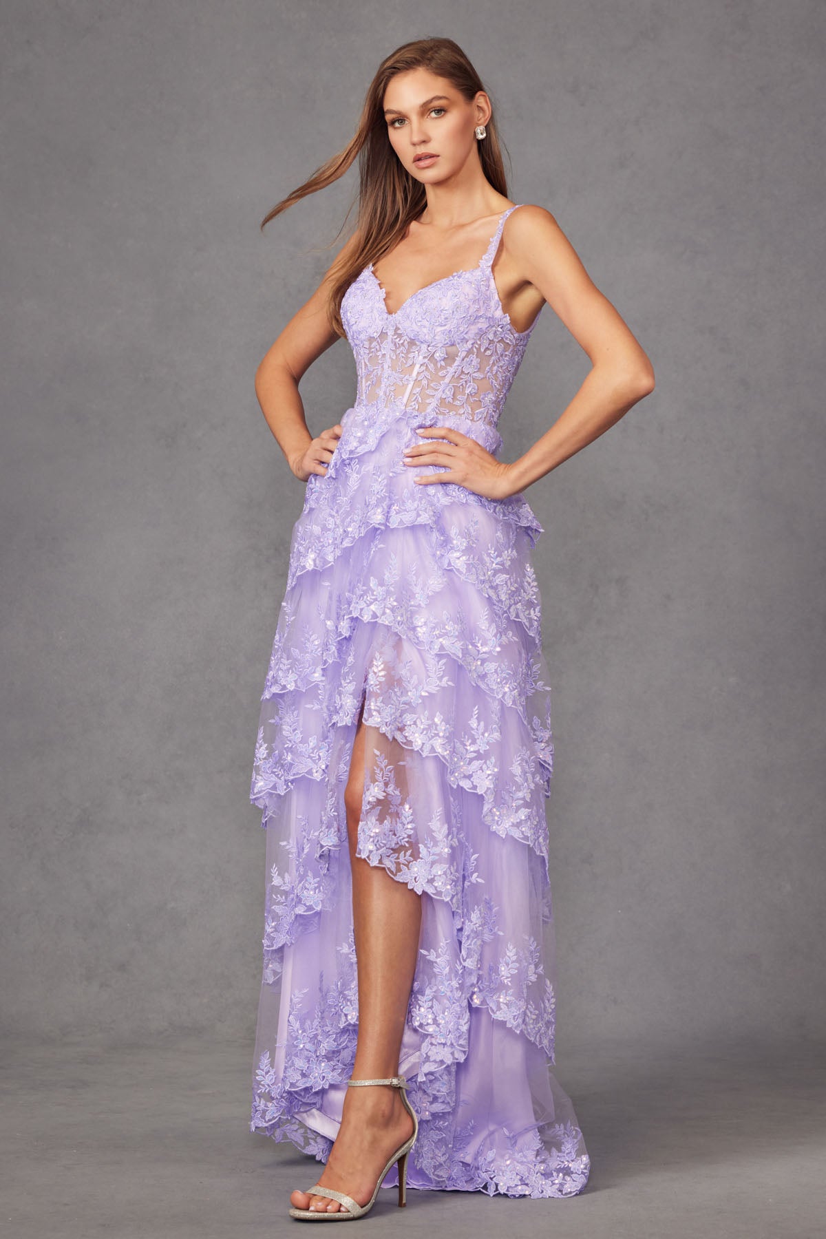 Vestido de fiesta sin mangas de corte-A con volantes y cuerpo de encaje de Juliet JT2451S