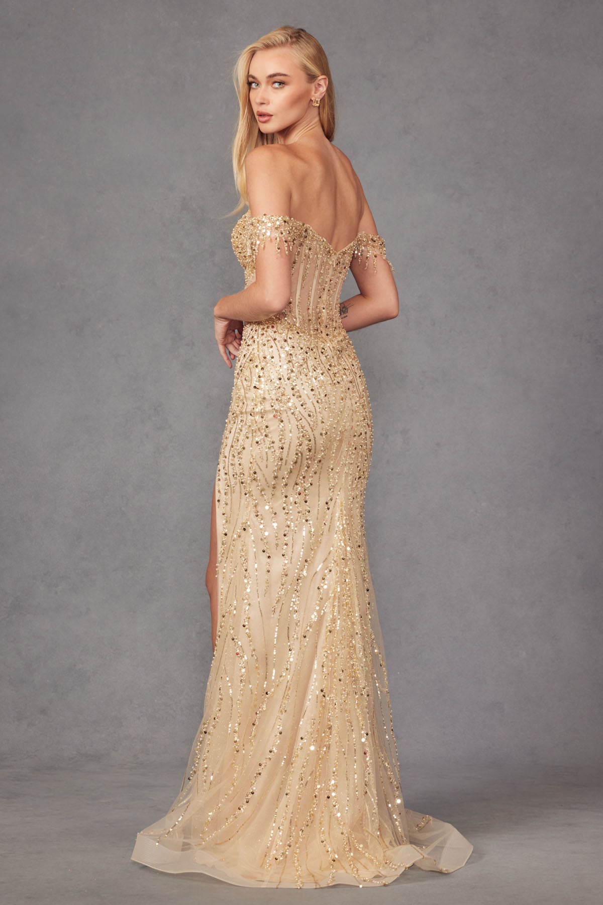 Vestido de gala con apliques de lentejuelas y hombros descubiertos de Juliet JT1458J