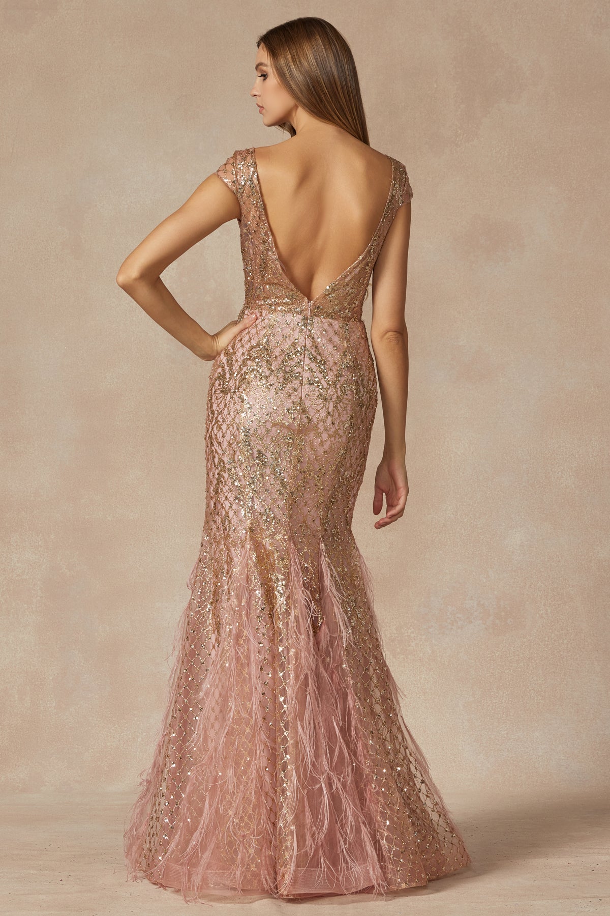 Vestido de plumas con hombros descubiertos de lentejuelas de Juliet 292