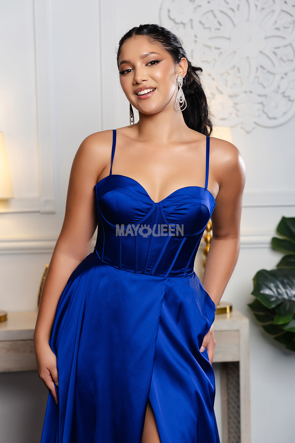 Vestido satinado de talla grande con pedrería y abertura de Ladivine CDS529C