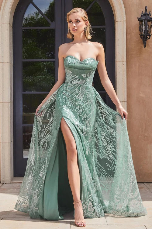 Vestido de corte A con abertura, cuerpo de encaje y satén sin tirantes de Ladivine CM368